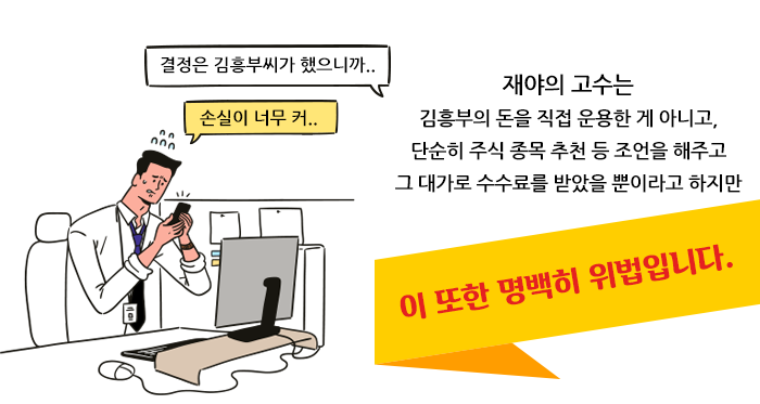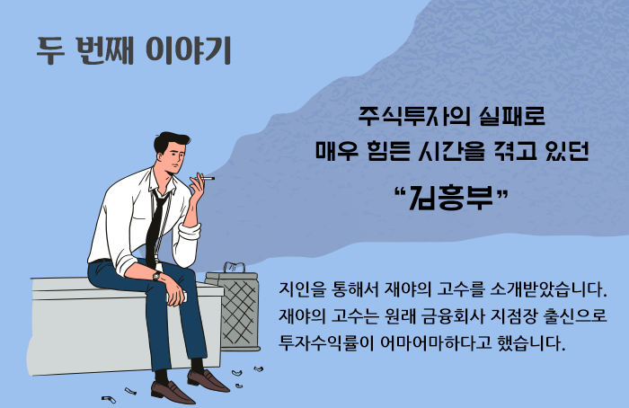 재야의 고수에게 종목 추천 대가로 수수료를 내고, 돈은 직접 운용하면 된다고 해서 김흥부는 안심이 되었습니다. 그래서 수수료를 내더라도 투자 고수의 조언을 받아 돈을 번다면 괜찮다고 생각했죠.