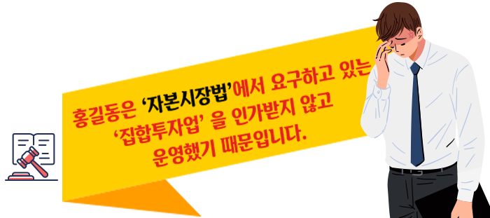 자본시장법에 따르면 이 집합투자업은 금융당국으로부터 인가를 받아야 합니다. 이를 어기면 자본시장법에 의거 5년 이하의 징역이나 2억 원 이하의 벌금형에 처해질 수도 있습니다. 설사 투자자들이 손실을 보지 않았다고 하더라도 마찬가지입니다.
