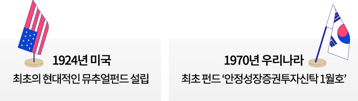 미국에서 최초의 현대적인 뮤추얼펀드는 1924년 설립됐으며, 현존하는 가장 오래된 뮤추얼펀드는 1929년에 설립된 뱅가드 웰링턴펀드(Vanguard Wellington Fund)입니다.
