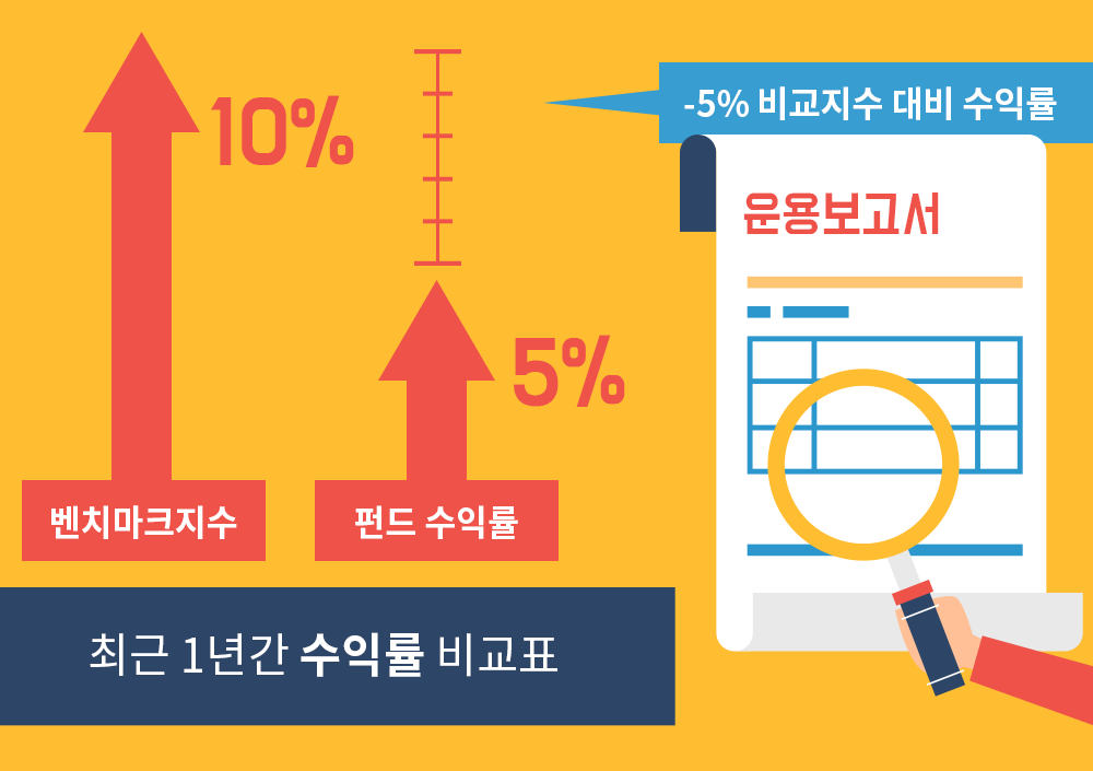 위 표와 같이 최근 1년간 코스피지수가 10% 상승했고, 펀드의 수익률이 5%상승했다면 이는 벤치마크지수인 코스피시장의 지수보다 5% 덜 상승했다는 것을 의미하기 때문에 운용보고서에는 -5% 비교지수대비 수익률로 표시가 됩니다.