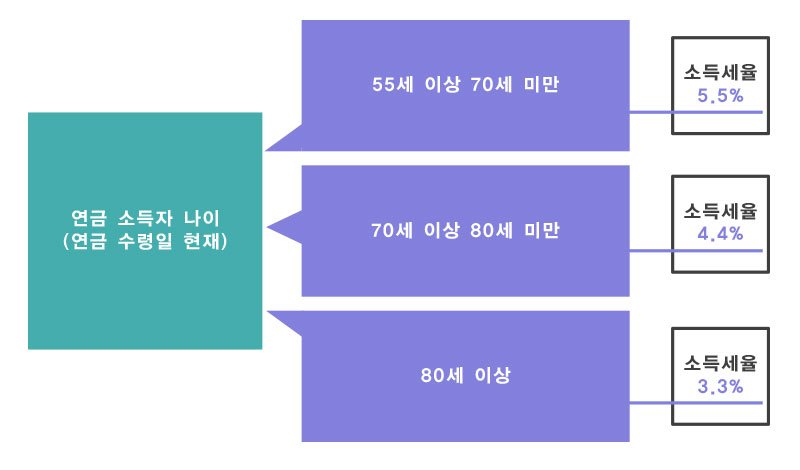 5년 이상 납입하고, 만 55세부터 연금을 수령하시게 된다면 일반적으로 적용되는 금융소득세율(15.4%)가 아닌 3.3~5.5%의 낮은 세율이 적용되어 연금마련에 최적화가 되어 있습니다.