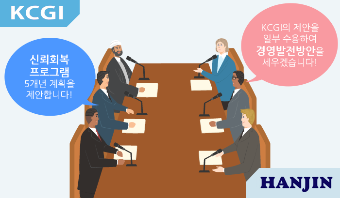 주주행동주의 사모펀드인 한국기업지배구조개선펀드(KCGI)가 한진그룹 상장사들의 주식들을 사모아 지분율을 높이더니 높은 부채비율 등 주가 저평가의 원인들을 조목조목 지적하며 ‘신뢰회복 프로그램 5개년 계획’을 공개적으로 제안하는 등 행동에 나섰던 것이다.