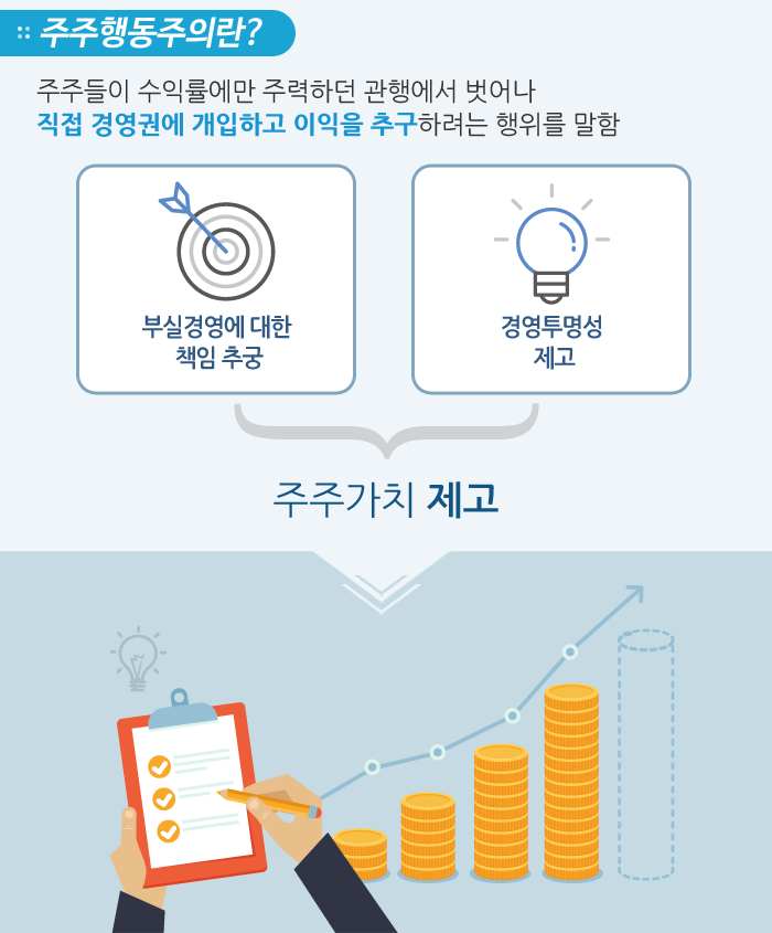 주주행동주의란 펀드들이 수익률에만 주력하던 관행에서 벗어나 직접 경영권에 개입하고 이익을 추구하려는 행위를 말한다.