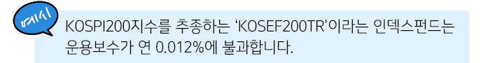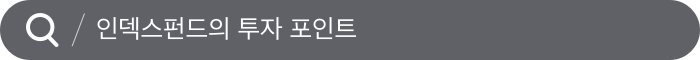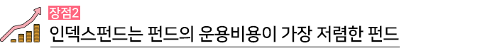 지수 대비 초과수익을 달성하는 것을 목표로 하는 액티브 펀드(Active Fund) 대비 리서치에 대한 부담이 적고, 상대적으로 주식을 자주 사고팔 필요도 없기 때문에 주식매매 비용도 적게 들어 펀드 운용비용이 가장 저렴합니다.