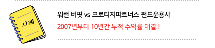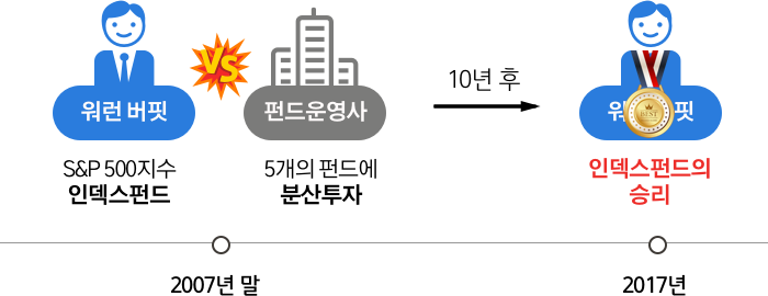 투자의 현인이라고 불리는 워런 버핏은 2007년 말 프로티지파트너스라는 펀드 운용사와 앞으로 10년 후의 누적수익률에 대한 대결을 하기로 합니다.