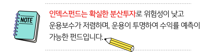 인덱스펀드는 특정 주가지수(예:KOSPI200)의 수익률과 동일하거나 유사한 수익률 달성을 목표로 하는 단순한 목표의 펀드입니다.