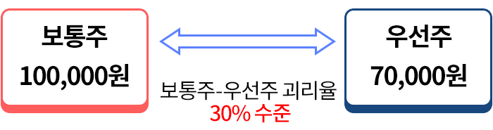 그런데 어느 날 ABC보통주 주가가 100,000원임에도 불구하고 ABC우선주 주가가 70,000원에 거래가 되는 비정상적인 상황이 되었습니다. 보통주와 우선주의 괴리율이 30%로 축소된 것이죠.