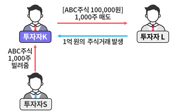 투자자K는 (1억 원에) ABC주식을 1,000주를 빌려와 주당 100,000원에 매도합니다.