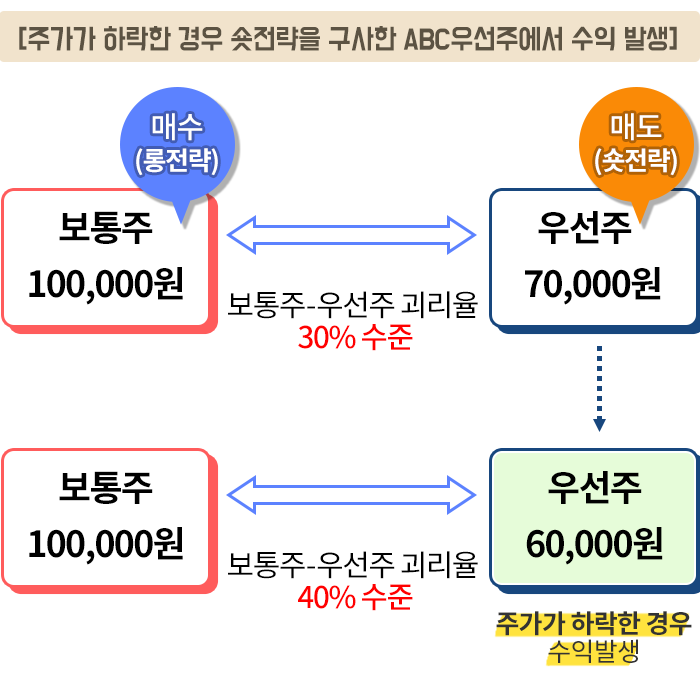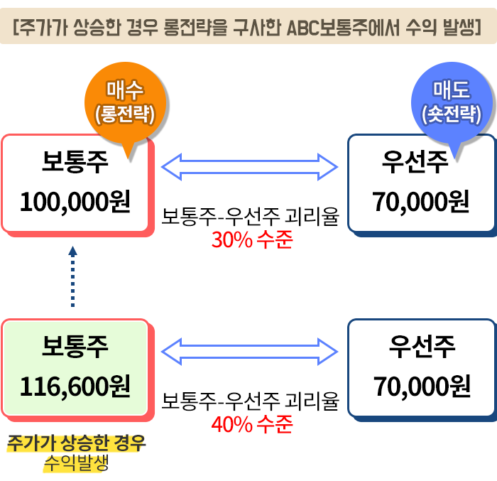 이 때 투자자가 ABC보통주를 매수하고 동시에 ABC우선주를 매도하면, 다시 두 주가가 정상적인 상황으로 회귀되었을 때에 투자자는 수익을 거둘 수 있습니다.