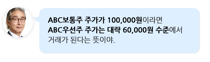 예를 들어 ABC 주가는 보통주 주가 대비 우선주 주가가 보통 60% 안팎에서 형성되는 것이 그동안 통계적으로 일반적인 상황이었다고 가정하겠습니다.