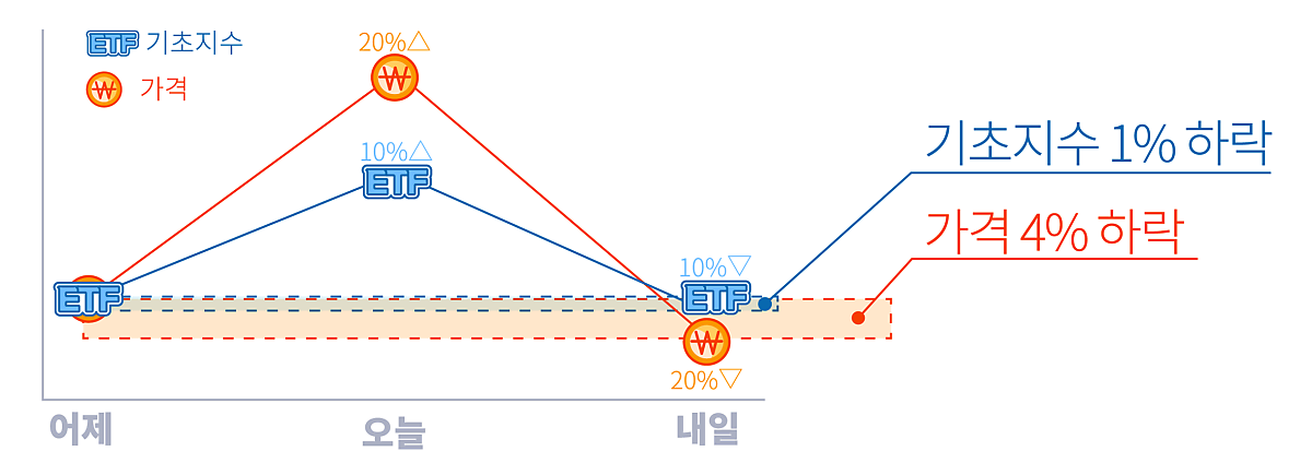 예를 들어 레버리지 ETF의 기초지수 100을 기준으로 오늘 10% 상승하여 110이 되면 ETF 가격 1만원 기준으로 20% 상승하므로 종가는 1만2000원이 되고 다음날 다시 기초지수가 10% 하락하면 기초지수는 99가 되고 ETF 종가는 20% 하락하여 9600원이 된다. 2일 동안 1% 하락했지만 ETF 가격은 4% 하락한 것이다.