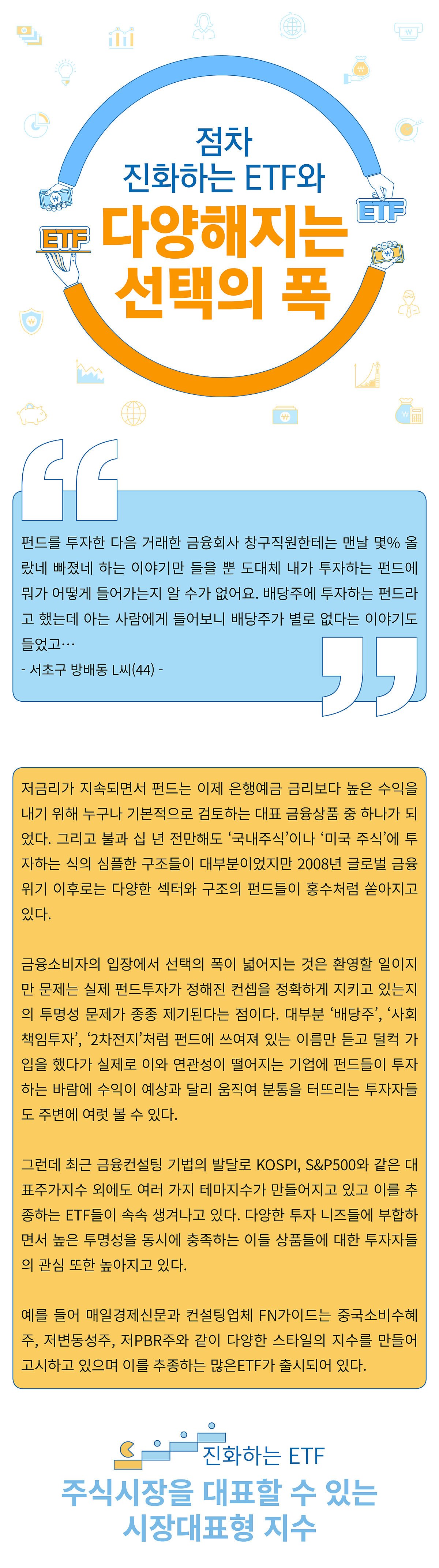 특정 업종에 자신이 있다면 자동차, 반도체, IT, 소비재 등 특정 업종에 소속된 기업들로 지수를 구성해서 그 업종지수를 추종하는 섹터(업종)형 ETF가 유리하다. 현재 KOSPI와 KRX의 업종구분기준별로 웬만한 섹터 ETF는 출시가 되어 있어서 이를 바탕으로 한 매크로 투자도 가능하다.