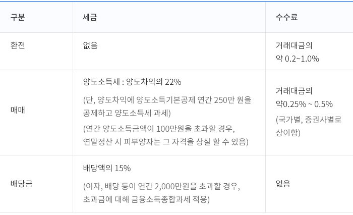 단, 해외 투자의 경우 국내 거래와는 세금 및 수수료 체계가 다르며, 해외 거래의 경우 미국 기준 0.25% 정도의 수수료를 내게 되는데(증권사별 상이함), 이는 국내보다 거의 10배에 가까운 수준이므로 투자 시 각별히 유의해야 합니다. 또한 원화-달러로 거래 통화가 다르기 때문에 환율변동에 의해 손실이 발생될 수 있으며, 환전에 따른 수수료도 고려해야 합니다.