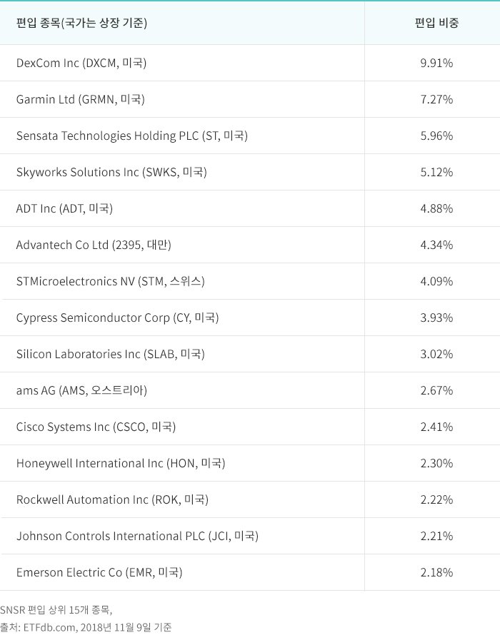 특히 SNSR 49개 편입 종목 중 70%가량이 핵심 기술을 가지고 있는 중소형 업체(중형주 42%, 소형주 18%, 초소형주 9%)이며, 편입 상위 기업으로는 DexCom Inc (미국 상장, 비중 9.91%), Garmin Ltd (미국 상장, 비중 7.27%), Skyworks Solutions Inc (미국상장, 비중 5.12%) 등이 있습니다. (출처 : ETFdb.com, 2018년 11월 9일 기준)