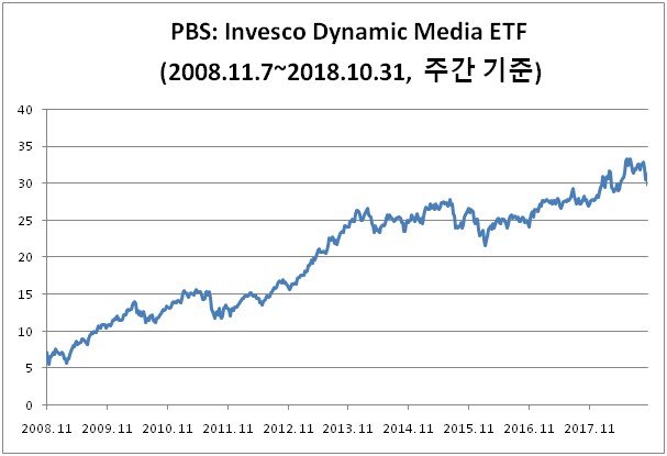따라서 개별 미디어 기업에 투자하는 것보다 미디어 기업들을 두루 포함하고 있는 ETF 에 투자하는 것이 하나의 대안이 될 수 있습니다. 예를 들어, PBS는 디즈니, 넷플릭스를 포함한 미국 거대 방송 미디어 관련 기업들을 두루 포함하고 있는 ETF이며 세계적인 자산운용사 중 하나인 인베스코(Invesco)가 운용하고 있습니다.