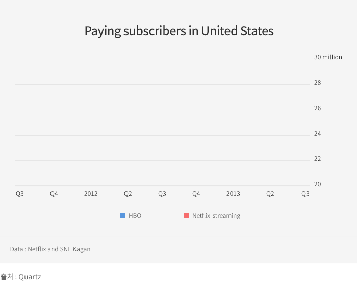 또한 아래 차트에서 보시다시피 넷플릭스가 2013년에 이미 HBO의 유료 구독자 수를 넘어선 가운데, 금번 M&A는 AT&T가 넷플릭스(NFLX)라는 거대 공룡에 제대로 맞서 보겠다는 의지를 보인 것과 같습니다.