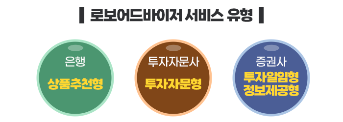 투자자들이 접할 수 있는 로보어드바이저 서비스는 은행의 상품추천형 서비스, 투자자문사의 투자자문형 서비스, 증권사의 투자일임형 서비스 및 정보제공형 서비스 등이 있습니다.
