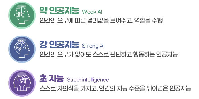 인공지능의 발전 단계를 보면 ‘약 인공지능’, ‘강 인공지능’, ‘초 지능’으로 구분할 수 있는데요. 현존하는 인공지능은 ‘약 인공지능’에 불과합니다.