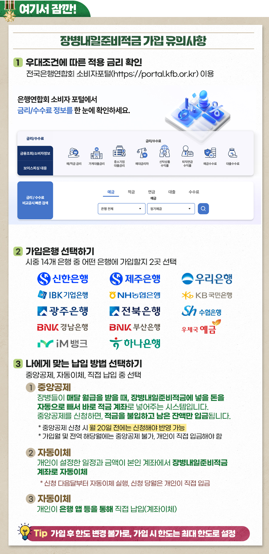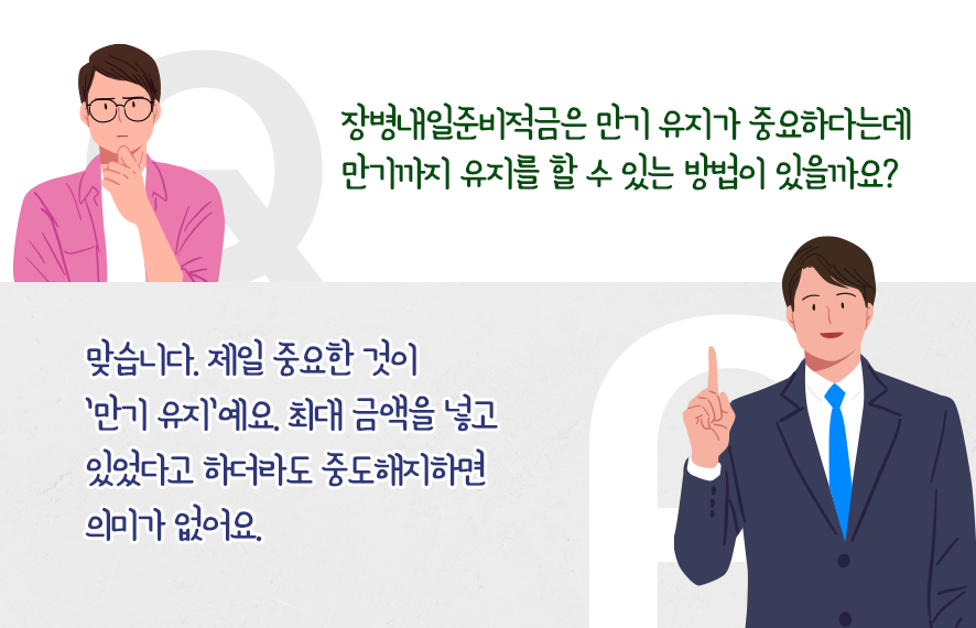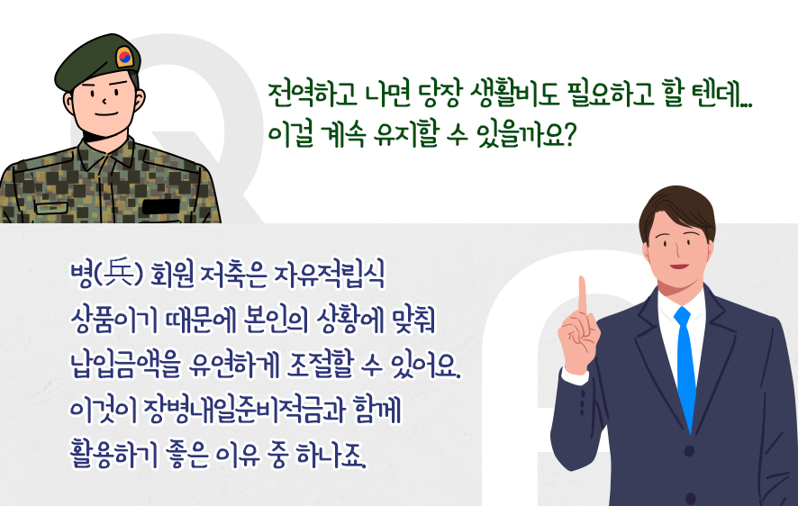 복무 중 가입해 상병/병장 때 여유자금을 조금씩 적립하고 전역 후 취창업을 준비하는 동안에 힘들다면 납입액을 월 1만 원만 넣어도 됩니다. 계좌만 유지하는 거죠. 그러다가 저축 여력이 생기면 그때부터 본격적으로 더 넣으면 됩니다.