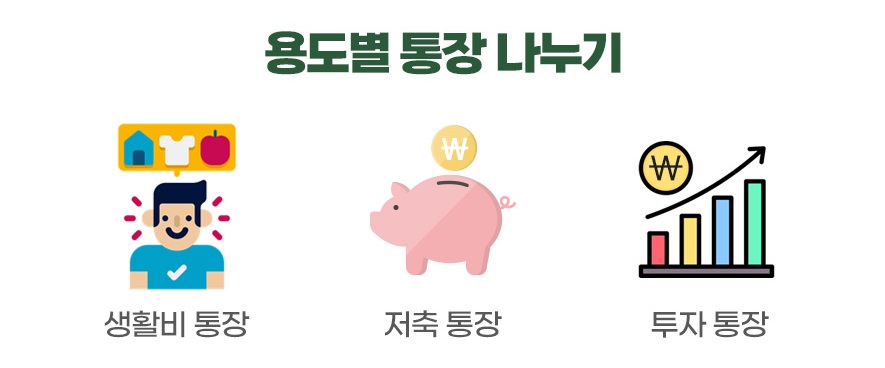 이렇게 목적에 따라 통장을 나누면 급한 일이 생겨도 당황하지 않고 생활비와 비상금 통장으로 활용할 수 있고, 장기 목표는 목표 통장으로 달성하고, 투자는 여유를 가지고 할 수 있게 됩니다.