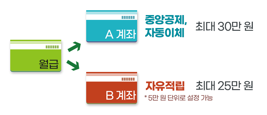 B 계좌는 매달 자유롭게 적립하고 상황에 맞추어 적립하면 되죠. 물론 최대 혜택인 55만 원에 맞추어 25만 원까지 넣을 수 있으면 좋겠지만 상황이 여의치 않 달은 적게 넣거나 심지어 안 넣어도 됩니다.
