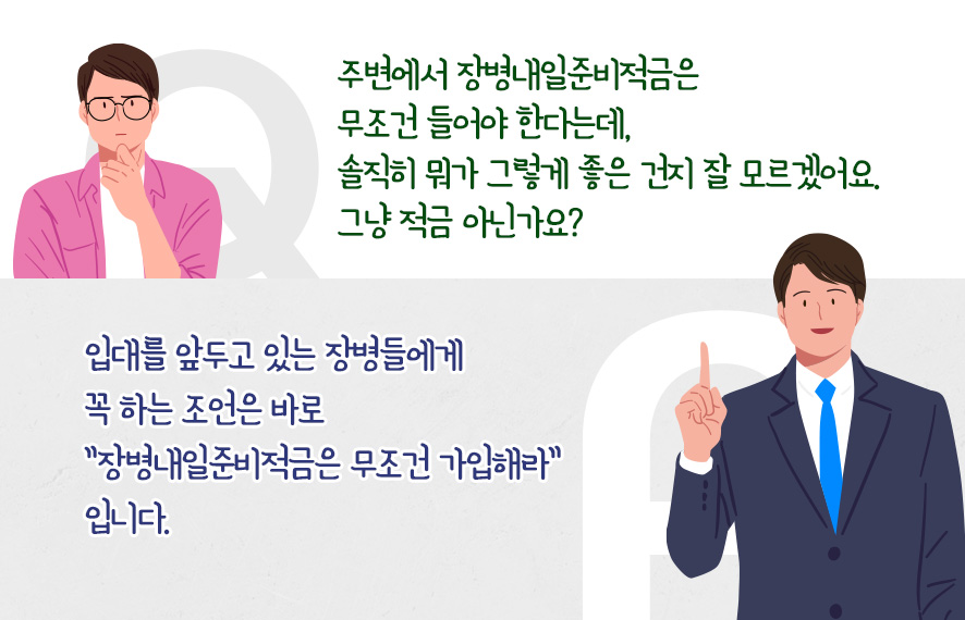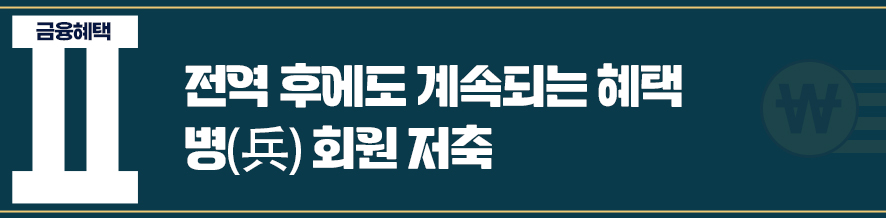 복무 중에 가입하면 전역 후에도 34세 전까지 최장 10년을 유지할 수 있고, 자유적립형 고금리 상품으로 비과세 혜택을 받을 수는 없지만 가입 기간이 길수록 효과가 커지는 이점이 있습니다.