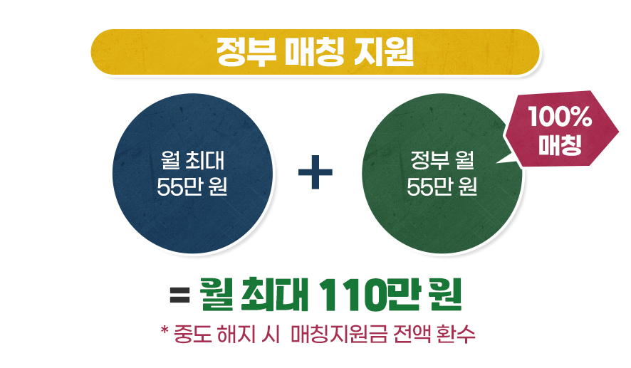 2025년 기준으로 최대 월 55만 원까지 저축할 수 있는데 내가 넣은 만큼 1:1로 매칭해 줍니다. 월 55만 원을 넣으면 55만 원, 월 30만 원을 넣으면 30만 원, 월 10만 원을 넣으면 10만 원을 정부가 똑같이 매칭해 주죠.