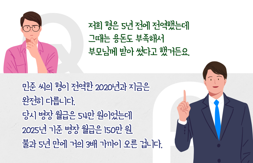2025년 기준 병장 월급은 150만 원. 의식주가 모두 제공되는 환경에서 군 복무자를 위한 특별한 금융상품까지 활용하면 월 150만 원 저축도 충분히 가능한 상황입니다. 일반 직장인이 월 150만 원을 저축하려면 실제로는 월급 300만 원은 넘어야 하죠.