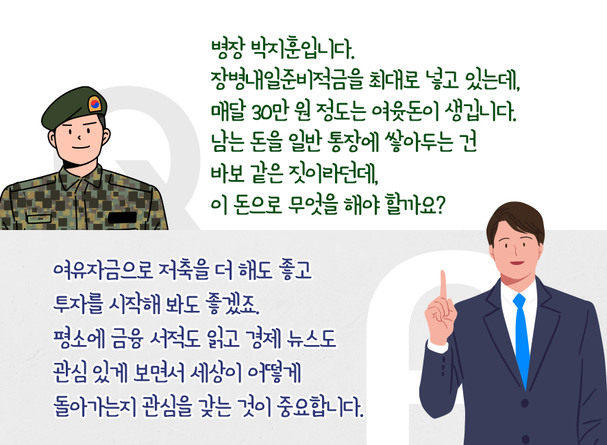 군 복무 중인 지금뿐 아니라 인생 전반에 있어서 돈을 모으고 불리는 과정의 핵심은 저축과 투자 사이의 균형을 조절하는 것입니다. 단순히 돈을 모으는 것만으로는 부족하고 그렇다고 투자만 하기에는 투자가 가지는 원금 손실의 위험성 때문에 불안할 수 있죠. 그래서 둘 사이의 균형이 중요해요. 병장인 지금은 전역 후까지 내다보면서 여유 자금을 어떻게 관리해야 할지 생각해 봐야 합니다.