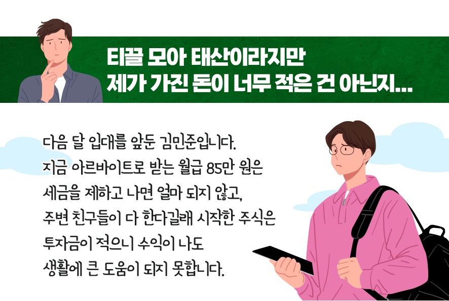 이런 현실 때문일까요? 20대 주식 계좌 보유자는 약 520만 명(한국예탁결제원, 2024)으로 20대의 70%가 주식 투자를 하고 있습니다. 하지만 많은 청년들이 민준 씨처럼 불안합니다. 적은 금액으로 시작한 투자는 수익이 나도 미미하고, 코인은 위험하고, 펀드는 종류도 많아 어떤 걸 골라야 할지 모르겠죠.