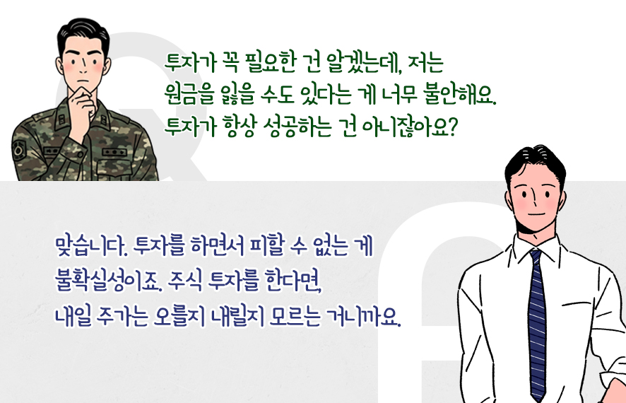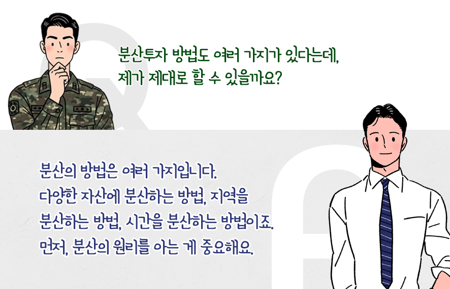 그래서 군 생활을 하면서 전략적으로 투자를 시작할 때 알아야 할 내용들을 다뤄보려고 합니다. 열심히 모은 투자 원금의 손실 위험성을 줄일 수 있도록 분산투자는 어떻게 시작해야 하는지, 군 복무 기간, 시간의 힘을 효과적으로 쓰는 방법을 다뤄 볼 거예요.