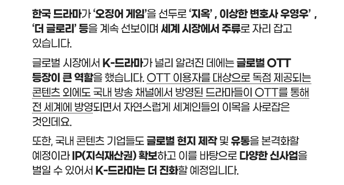 이에 체계화된 제작 시스템, 수준 높은 인력, 뛰어난 가성비 등을 바탕으로 퀄리티 높은 영화, 드라마 등을 만들어 낼 수 있는 한국의 콘텐츠 기업들이 글로벌 OTT의 많은 투자를 받고 있으며, 이를 통해 K-콘텐츠 또한 글로벌 시장에 진출해 큰 성공을 거두고 있습니다.