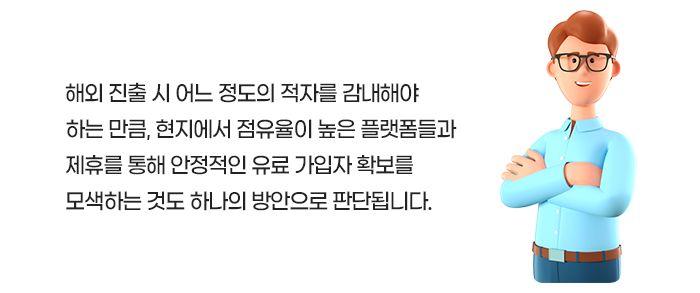 그건 아닙니다. 현재 한국 OTT 업체들도 글로벌 시장에 진출해 입지를 강화하고 있습니다. SK텔레콤과 지상파 3사의 합작으로 2019년에 서비스를 시작한 웨이브는 2022년에 북중남미 30개국 이상에서 K-콘텐츠를 제공하고 있는 코코와(KOCOWA)를 인수하고 글로벌 진출을 본격화하였습니다.