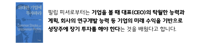 두 번째 선생님은 바로 필립 피셔로 필립 피셔의 책 ‘위대한 기업에 투자하라’를 읽고 감동하여 직접 필립 피셔를 찾아가기도 했습니다.