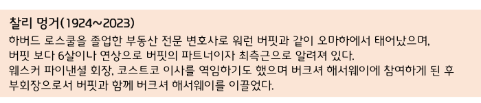 버핏은 두 선생님의 가르침을 바탕으로 삼고 평생의 동반자 찰리 멍거*와 함께 버크셔 해서웨이라는 회사를 이끌고 있습니다. 워런 버핏은 종종 자신이 성공할 수 있었던 이유 중의 하나가 찰리 멍거라는 훌륭한 친구를 만났기 때문이라고 말합니다.