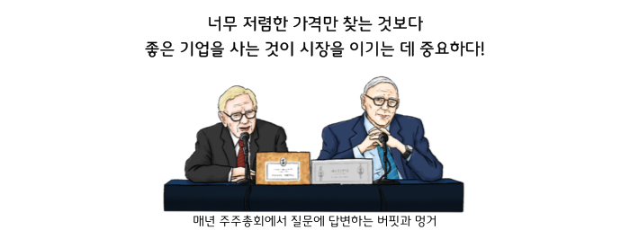 하지만 찰리 멍거와 같이 일하면서 버핏은 너무 저렴한 가격만 찾는 것보다 좋은 기업을 사는 것이 시장을 이기는 데 중요하다는 것을 깨달았으며, 이에 따라 그의 투자에 대한 생각이 좀 더 발전하게 되었다고 말했습니다.