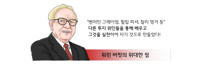 버핏의 위대한 점은 스스로 수익을 내는 방법을 알고 있었지만, 다른 투자 위인들을 통해 배우고 그것을 실천하여 자기의 투자방법으로 만들었다는 점이라고 할 수 있습니다.