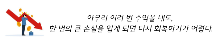 대부분의 투자자들은 주식시장에서 단기간에 큰 수익을 올려야겠다는 마음이 앞서, 잘 모르는 종목을 빈번하게 거래하기도 합니다. 하지만 주식투자에서 아무리 여러 번 수익을 내도, 주식투자의 경우 원금 보장이 안되기 때문에 한 번의 큰 손실을 입게 되면 다시 회복하기가 어렵습니다.
